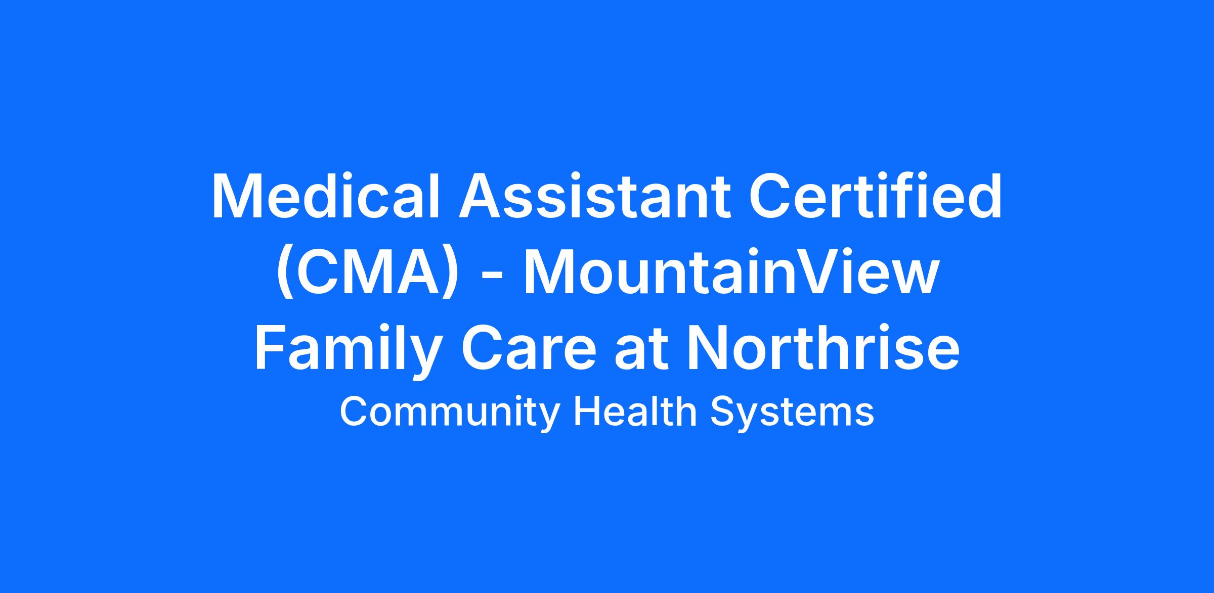 DescriptionAs a Certified Medical Assistant at MountainView Family Care at Northrise you’ll join a team and be a part of a culture that's dedicated to providing top quality care to our patients. Our full-time employees enjoy a robust benefits package which may include health insurance, 401(k), licensure/certification reimbursement, tuition reimbursement, and student loan assistance for eligible roles.
