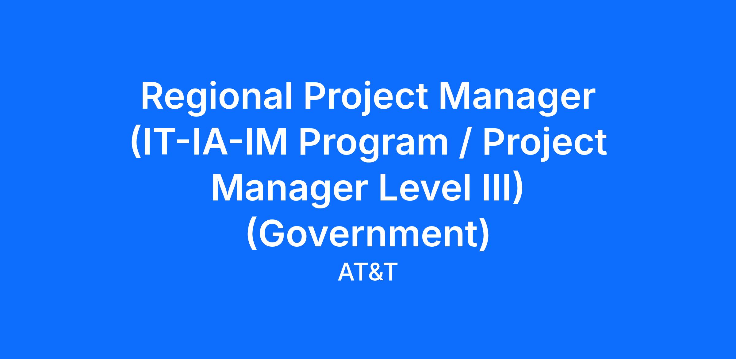 Our Regional Project Manager (IT-IA-IM Program / Project Manager Level III) (Government)1 earns between $78,800 - $216,703 yearly. Not to mention all the other amazing rewards that working at AT&T offers. Individual starting salary within this range may depend on geography, experience, expertise, and education/training.