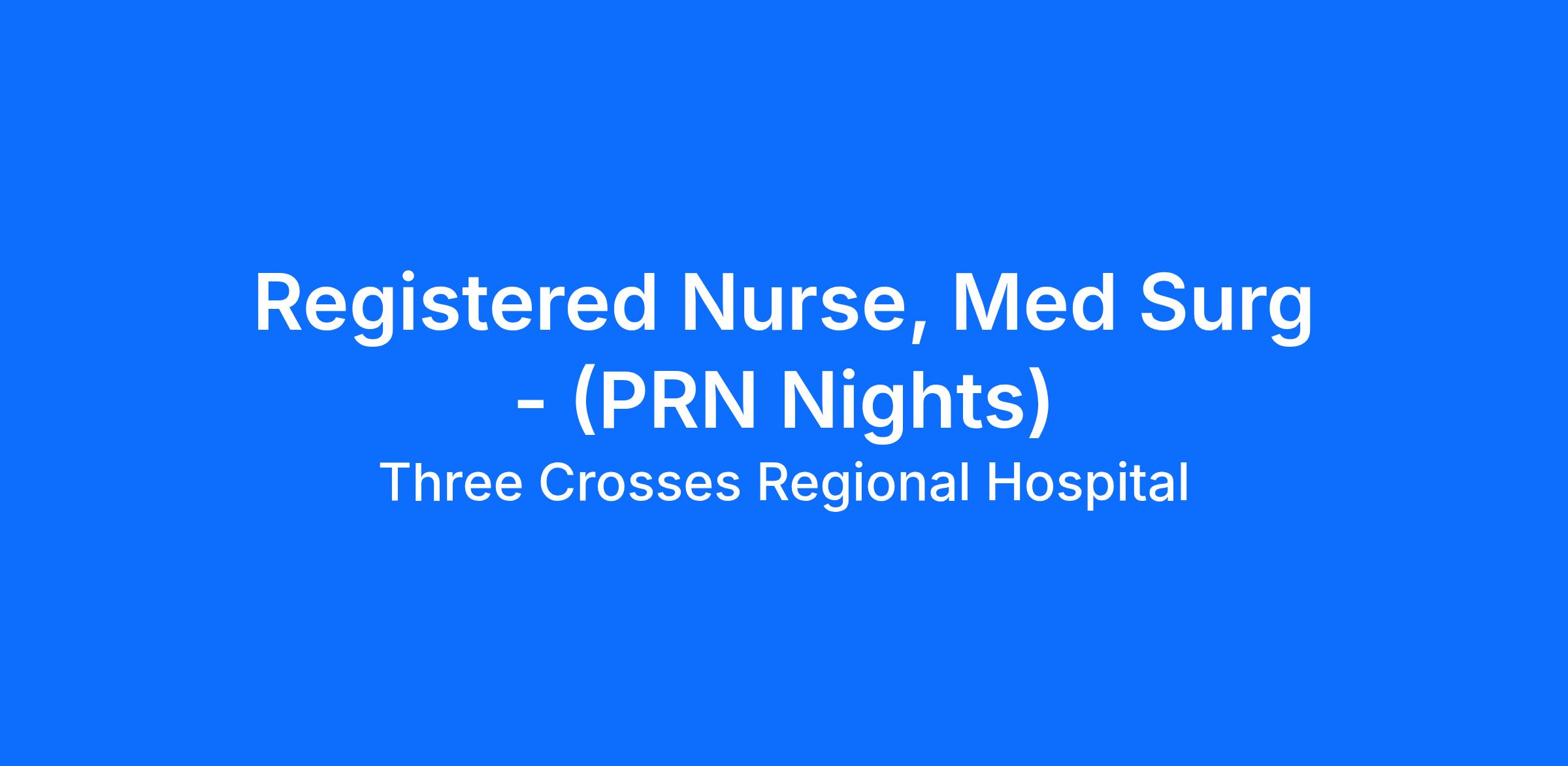If you're looking for a place to call home and grow, Three Crosses Regional Hospital is looking for you! We are looking for a Registered Nurse to join our Med Surg Team that is committed to clinical excellence and building a patient-centered culture.